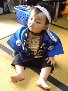 なだめてすかしてごまかして、やっとハチマキしてくれた。