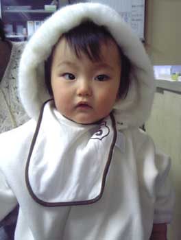 慌てて着せてみた、雪んこマント。
